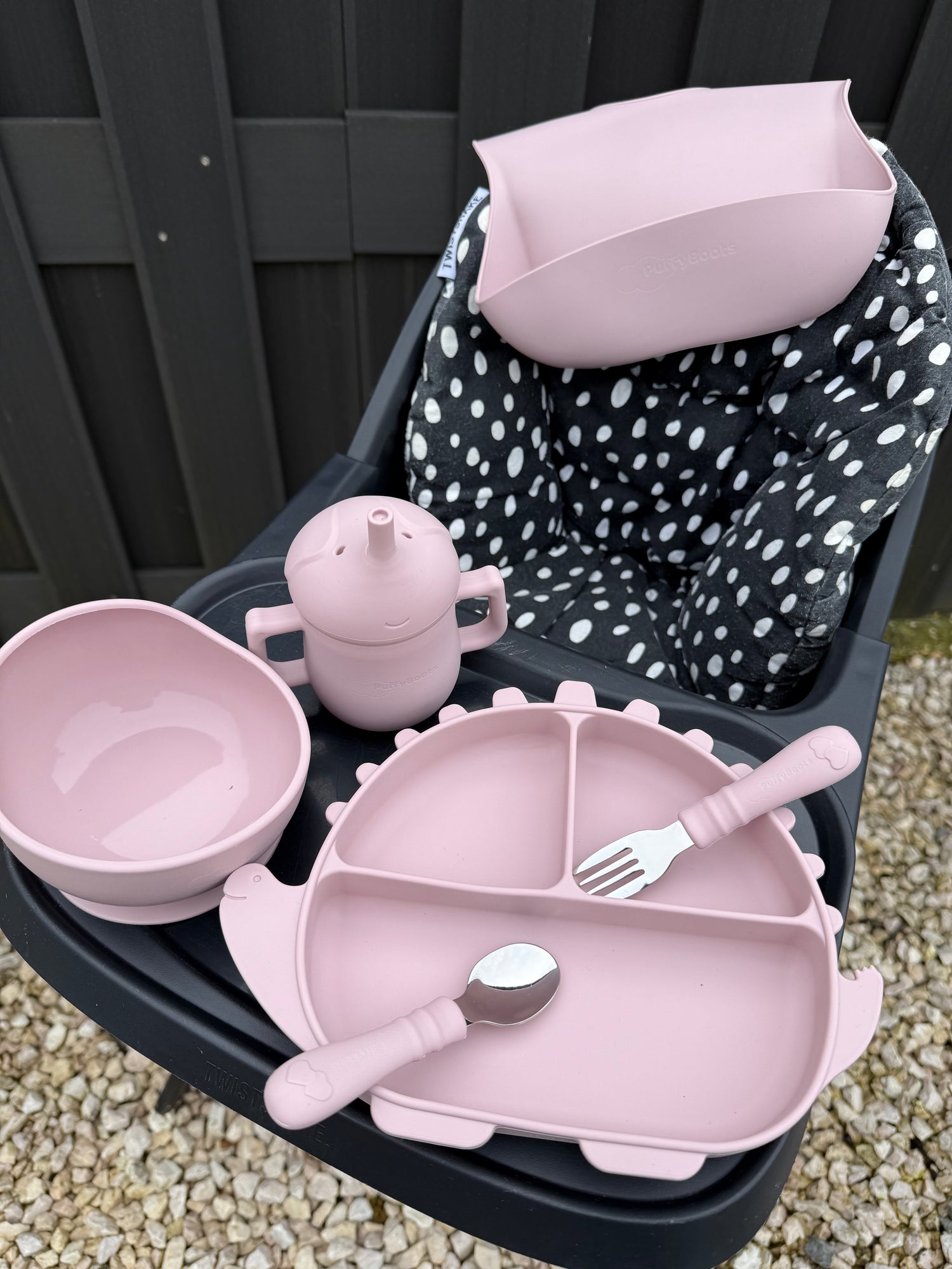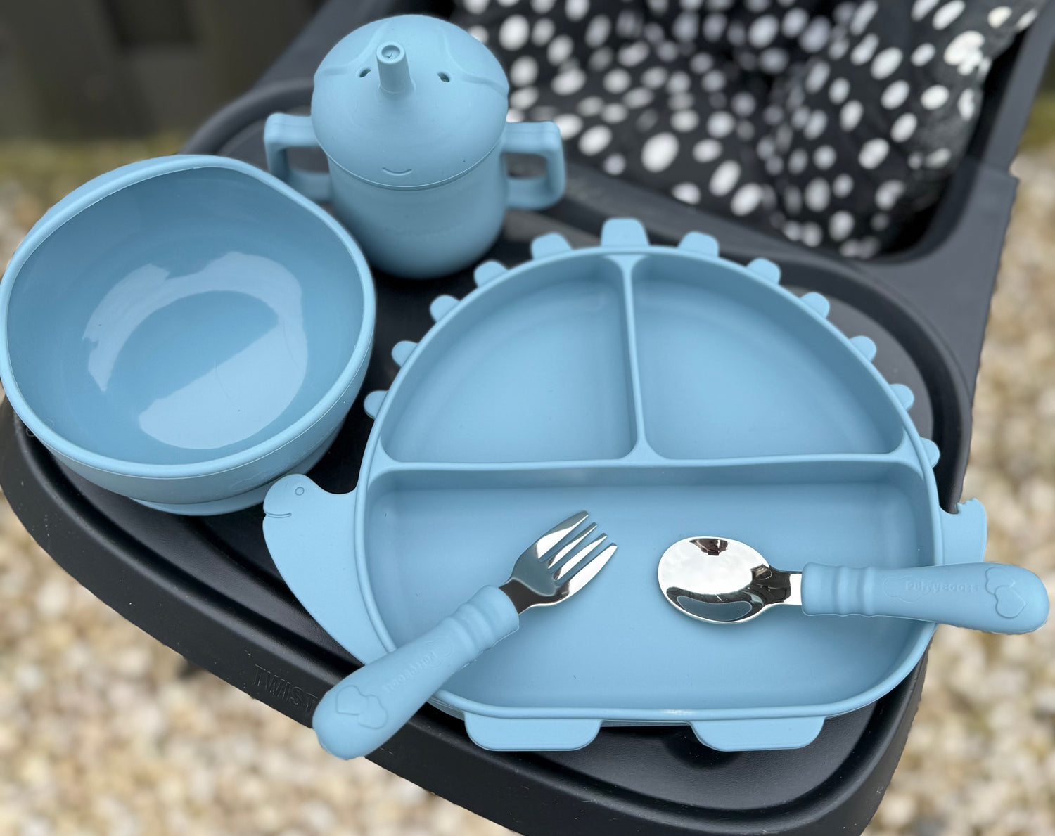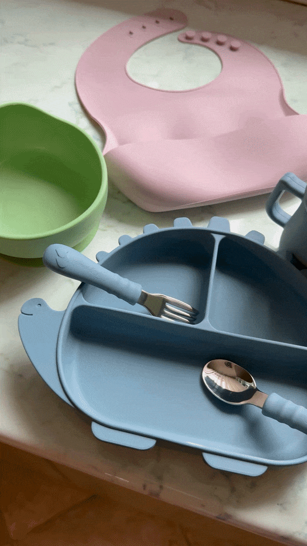 A PuffySzaurusz étkészlet kialakítása ideális a BLW-hez: